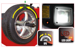 Automatic Positioning and LED Light At the end of the spin the wheel is braked and automatically brought to the balancing position. The integrated LED light illuminates the work area to facilitate rim cleaning and application of the counterweights. |